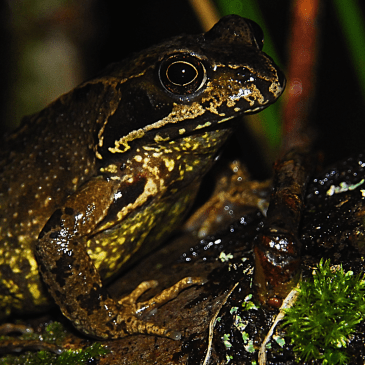 Adult frogs attain lengths of 6-8cm, with females typically being larger than males. The common frog’s cryptic colouration serves as excellent camouflage. While this species displays significant variations in colouration, there are certain characteristics which can help in identifying this species. This species frequently displays a dark band of skin along the eyes and back towards the tympanum (ears) though this feature can be diminished or absent in some individuals. A more persistent feature is the dark stripes across the animals limbs.